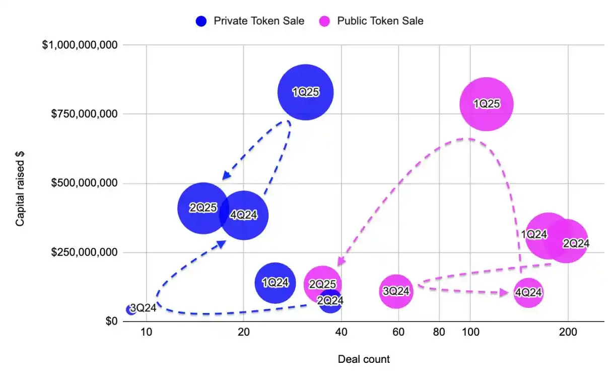 私募和公募销售之间的分歧延续了自 2023 年底以来追踪的趋势。公募代币发行在市场火热时激增,但私募轮反映的是一致性,而非炒作。