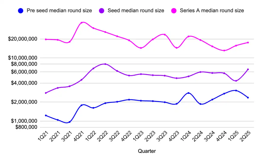 · 种子轮金额上升。种子轮融资中位数跃升至 660 万美元,扭转了第一季度的下降趋势,表明资本对早期阶段的信心增强。