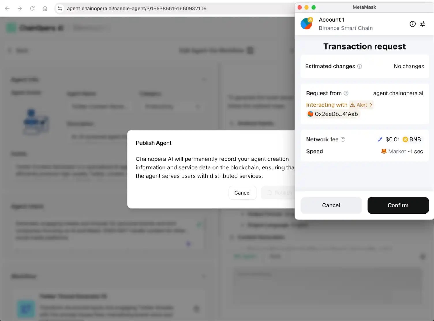依托于 ChainOpera 的区块链底层,每一个 Agent 都会上链存证,确保作者身份、透明度与永久性。任何人都可以验证该 Agent 的发布时间、创作者身份,以及使用频率。