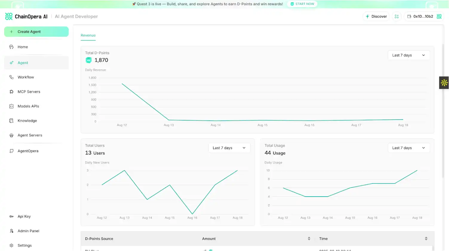 在 ChainOpera 上发布的每一个 Agent 都会生成一个独特的分享链接。创作者可以将其分发到社交媒体、网站,或直接分享给好友。每当有人使用该 Agent,开发者就能获得积分。用户与开发者之间,由此形成一个简单的 病毒式传播循环,不断提升曝光度与用户互动。