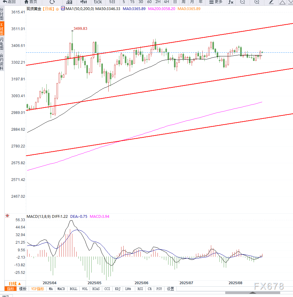 从日线图技术面来看,黄金走势正处于关键区间。目前价格在3350美元附近获得初步支撑,下方关键支撑位在3320美元附近,若跌破该水平,可能加速下探至3280美元。