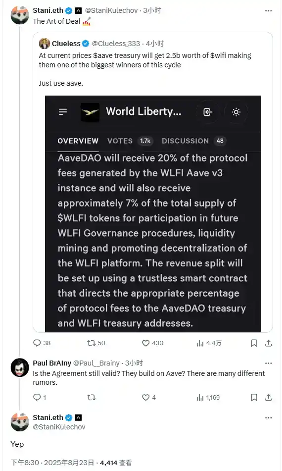 然而事件在近期出现戏剧性转折。昨日晚间,疑似 WLFI Wallet 团队成员、推特用户 @0xDylan_ 发推否认「Aave 将获得 WLFI 总量 7% 代币」的提案关联消息。对此,Aave 创始人 Stani.eth 迅速回应,指出该提案系由 WLFI 团队自行撰写并提交,且经 Aave DAO 依法投票通过,其本人还附上了原始提案链接作为凭证。