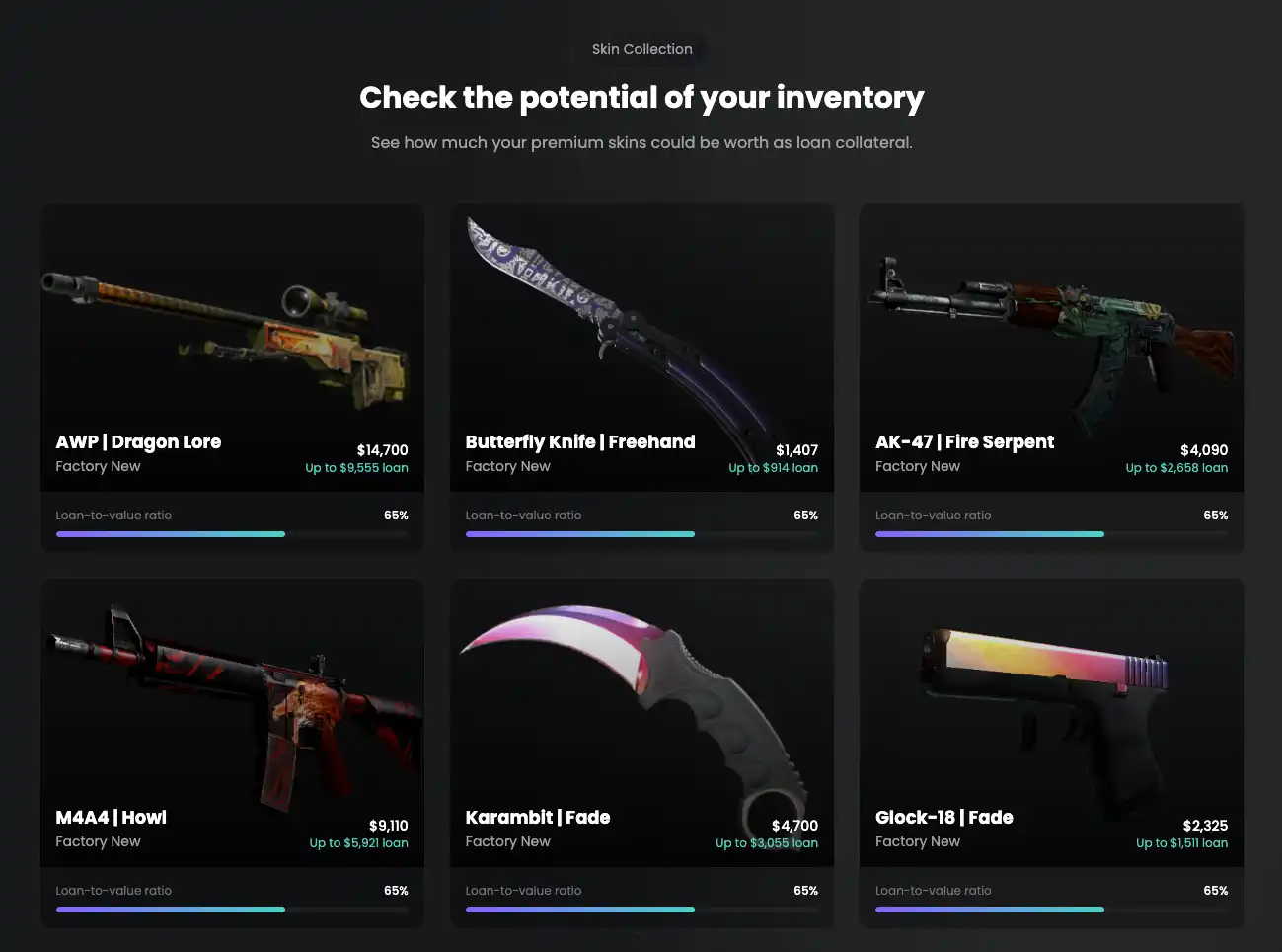 团队整合实时市场数据进行精准估值,玩家可以用 CS2 的皮肤为抵押获得即时现金贷款(价值的 65%)。