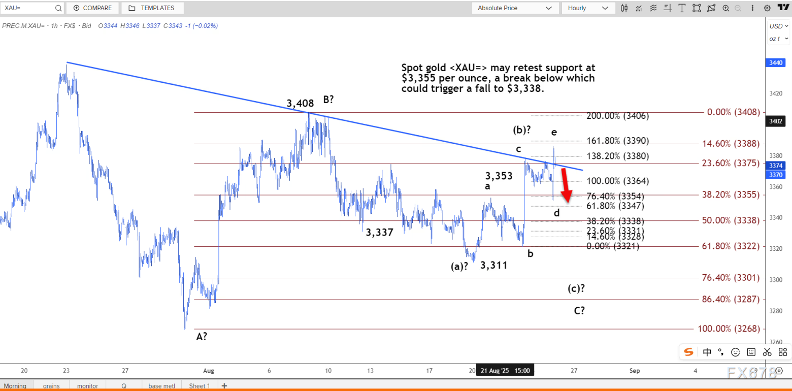 技术分析师指出,现货黄金目前可能重新测试每盎司3355美元的支撑水平。若有效跌破该位置,金价或进一步下探至3338美元。