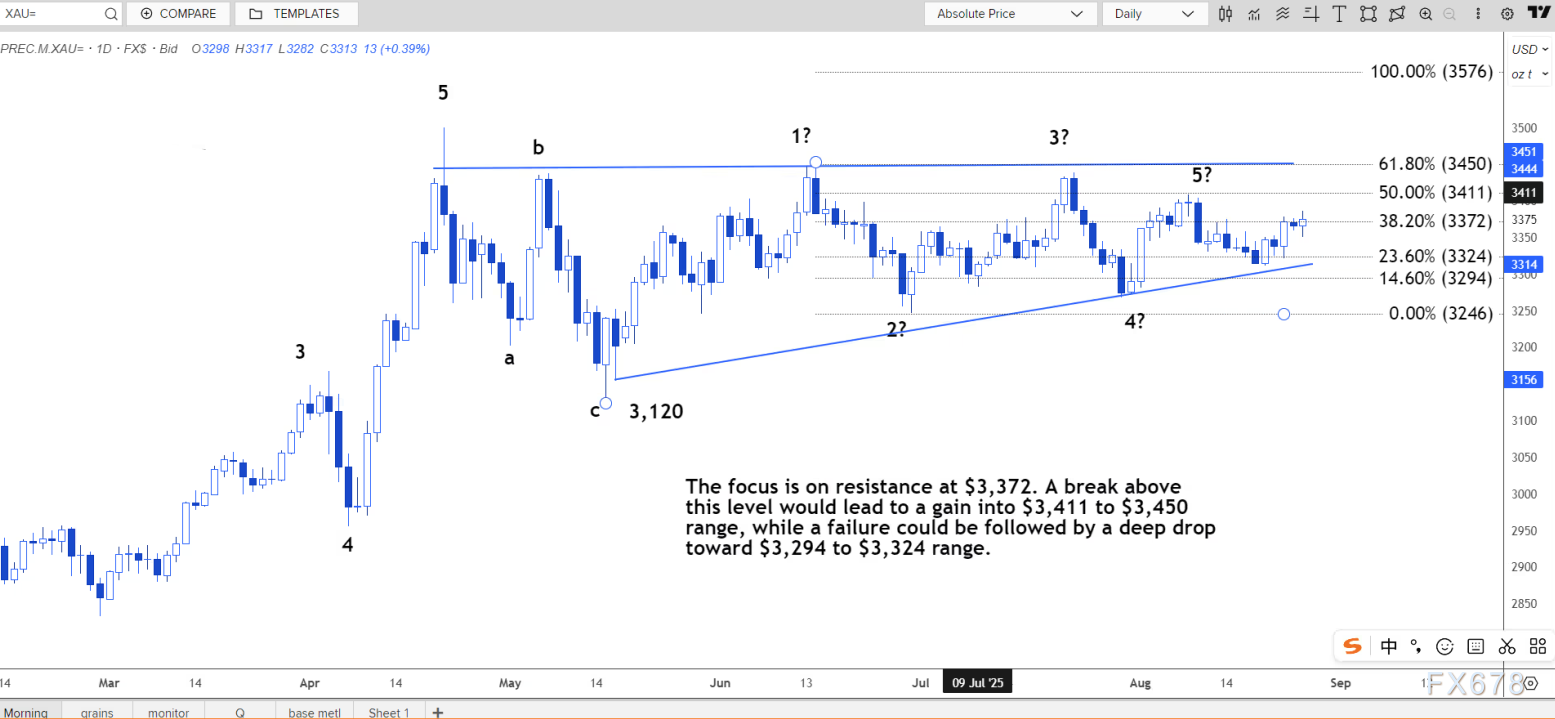 近期金价波动或源于自3311美元开始的五浪结构中的e浪推动。尽管价格已短暂突破一条下降趋势线,但这更可能意味着当前周期接近完成,而非新一轮上涨的开始。