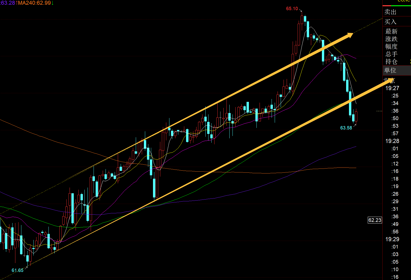 原油方面:原油日线四连阳之后,隔夜持续拉升突破黄色通道上轨,但今日又持续连阴失守通道下轨,所以暂不能急于去看涨反弹,又有打回震荡的可能性;稳妥留意支撑63,阻力65.8,靠边去看信号,做震荡;