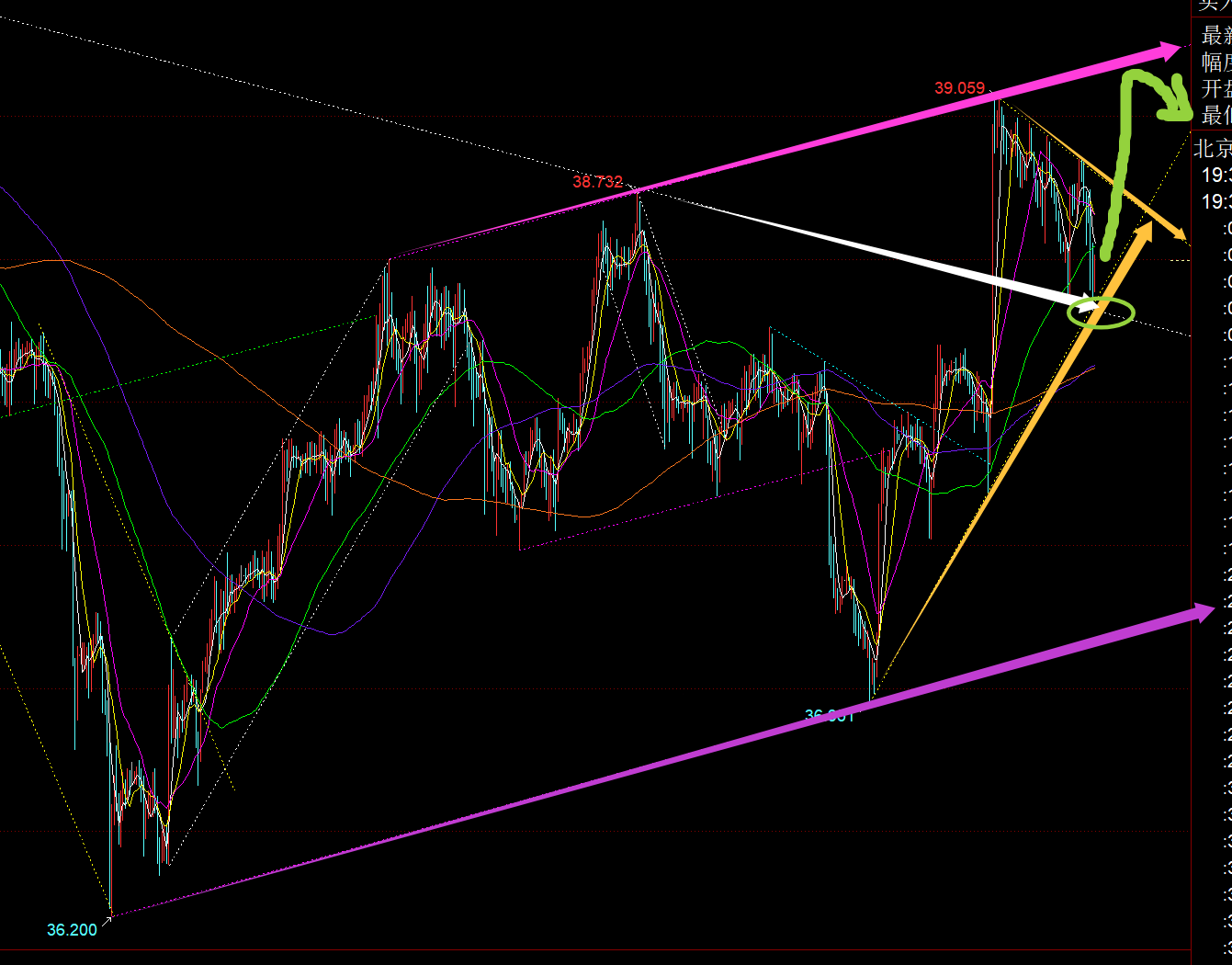 第二,白银方面:昨日研报等待原本支撑是38.4-38.35一线,而墨迹的震荡慢下行,一直给不到此处,晚间38.55一线出现企稳信号,则提前看涨一波,最高触及38.9,离目标39略差一步,受压于图中的黄色趋势阻力线;今日早间先急跌,才终于回踩确认白色趋势线支撑,给到了38.35支撑看涨位,也是一早才有肉吃;