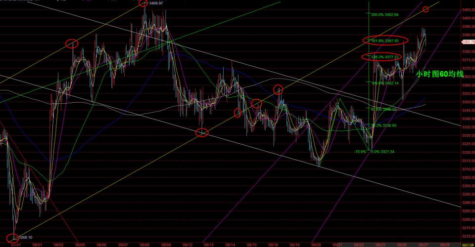 所以,基本上不能追涨。早间高点3394.50不破考虑回落,如果刺破话2倍拓展位置3403附近再考虑回落,这里预计和之前黄色通道下轨共振。下方的话关注小时图60均线的回踩,首次测试考虑最多,做好对应的风控即可。下方的话3367依然是个重点,不破之前是支撑,破位的话再考虑昨天低点支撑。最近这走势吧,就是大扫荡模式,看见明显的大涨或者大跌再去追涨杀跌风险很大,注意节奏控制。