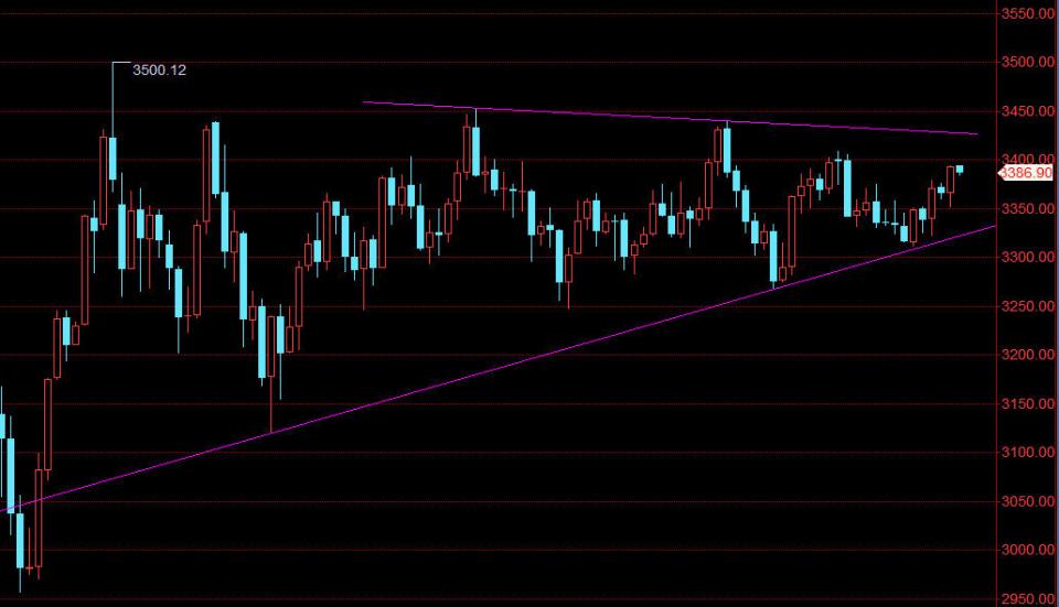 昨日黄金开盘3365.22美元,最高3393.66美元,最低3351.16美元,收盘3393.22美元,报收大阳线。8月8日文章《【格物金融】纷纷扰扰黄金终到3410美元,注意再度构筑短线顶部的潜能》我们提及黄金3410构筑短线顶部,最终黄金一路下跌测试3120-3268的连线。我们之前提及连线上还可能上涨一次,黄金最终3311上行,黄金上涨到3352之后,我们强调回踩次低点3323还要上冲3370美元上方之后再冲高回落。