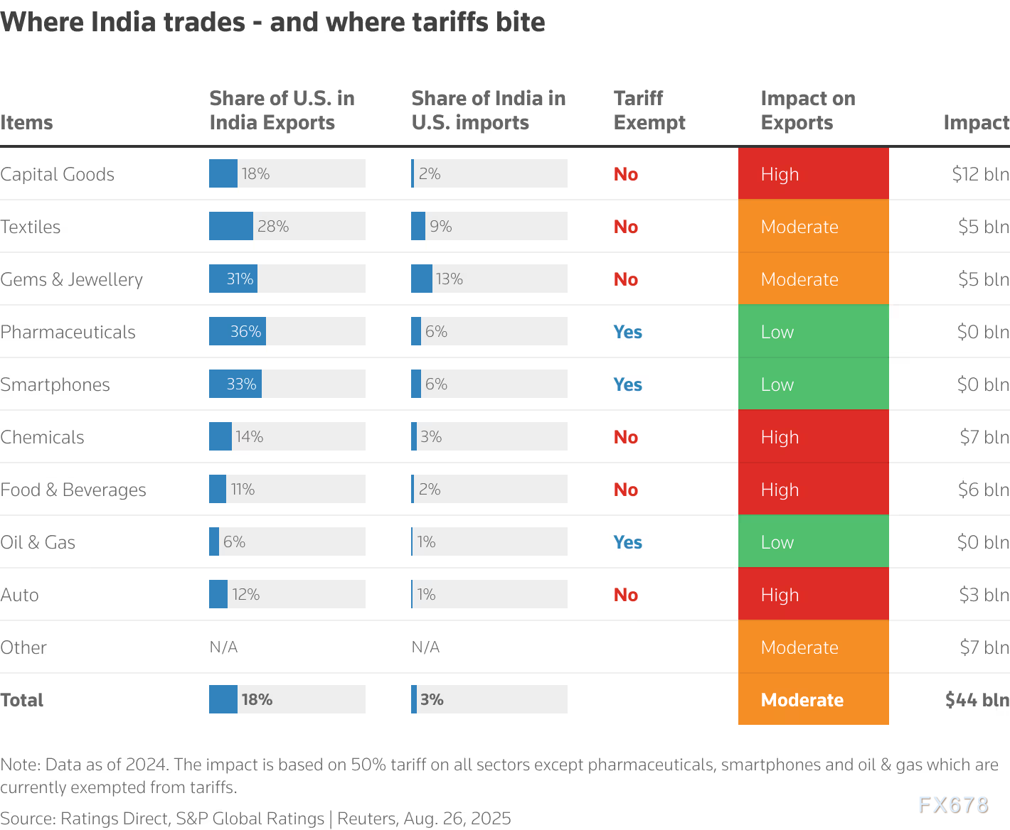 从印度国内市场看,此次关税覆盖印度输美870亿美元商品的55%,涉及数以千计出口企业(包括总理莫迪家乡古吉拉特邦的中小企业),市场对印度经济增速放缓、卢比贬值的担忧加剧。