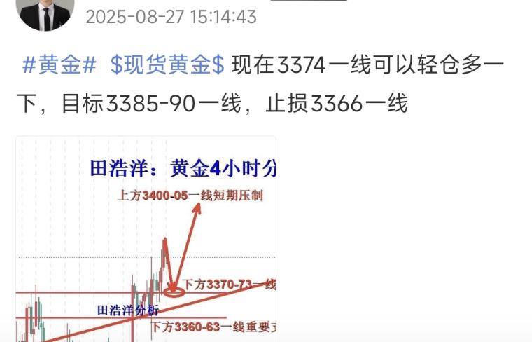 黄金今天早间3391一线空完美获利出局,下午我们3374附近多单完美再次获利,关注我的朋友都可以看到!