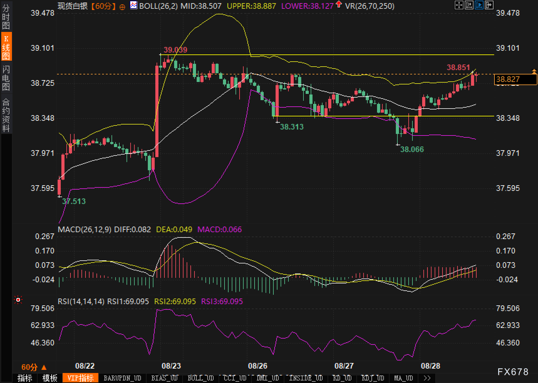 小时图(60分)显示,白银自38.066形成阶段性低点后震荡回升,当前围绕38.827运行。上方静态阻力落在39.039的前高与更上方39.10一线的水平阻力带;若出现有效突破,则可打开向上测试更高区间的空间。下方支撑观察38.507(布林中轨)与38.348、38.313两个密集成交区间;若跌破,则关注38.127(布林下轨)与38.066前低的共振支撑。