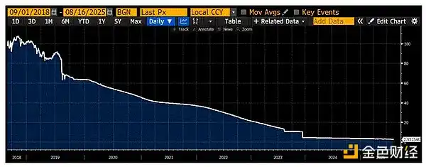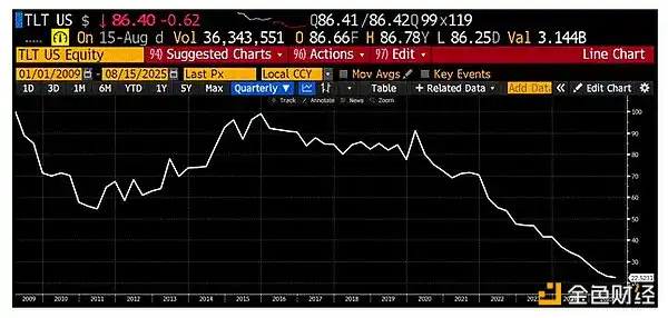 这是 TLT US ETF,它跟踪的是 20 年或更长期限的美国国债除以黄金价格后的走势。我从 2009 年开始将其指数设为 100。自 2009 年以来,相对于黄金,国债已贬值近 80%。美国政府的货币政策是救助其银行系统,同时坑害外国和国内的债务持有人。难怪外国央行开始效仿史高治·麦克老鸭(Scrooge McDuck,囤积黄金的卡通人物)。美国总统特朗普打算遵循类似的策略,但除了坑害债券持有人之外,他相信可以通过关税对外国资本和贸易流征税,从而让美国再次伟大。