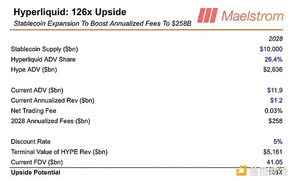 目前,Binance 的永续合约日均交易量为 730 亿美元,稳定币总供应量为 2770 亿美元;比率为 26.4%。你将在模型中看到这表示为 Hyperliquid ADV 份额(Hyperliquid ADV Share)。