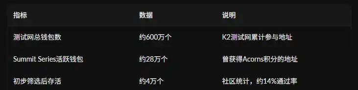 根据社区统计数据,参与 Camp Network 测试网交互的总钱包数高达 600 万个,其中 Summit Series 活跃钱包约为 28 万个,但符合空投资格地址仅有 4 万个。