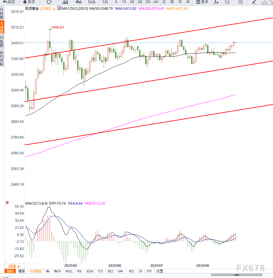 从日线图形来看,黄金自8月中旬企稳于3320美元一线后,呈现出明显的上升通道,目前K线运行在20日均线上方,显示多头趋势延续。