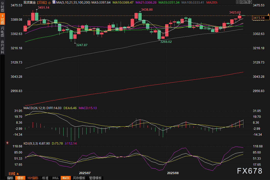 汇通财经APP讯——周五(8月29日)亚市早盘,现货黄金窄幅震荡,目前交投于3415.37美元/盎司附近。周四(8月28日),现货黄金价格强势突破3400美元心理关口,最高触及每盎司3423.02美元,创下自7月23日以来的五周最高点。这场金价飙升的背后,是美元走软、美联储独立性担忧以及避险资金涌入等多重因素的共同推动。白银同样表现抢眼,攀升至一个多月来的最高水平,彰显贵金属板块的整体强势。这场由政治、经济和市场情绪共同演绎的"黄金大戏",正在全球投资者面前精彩上演。