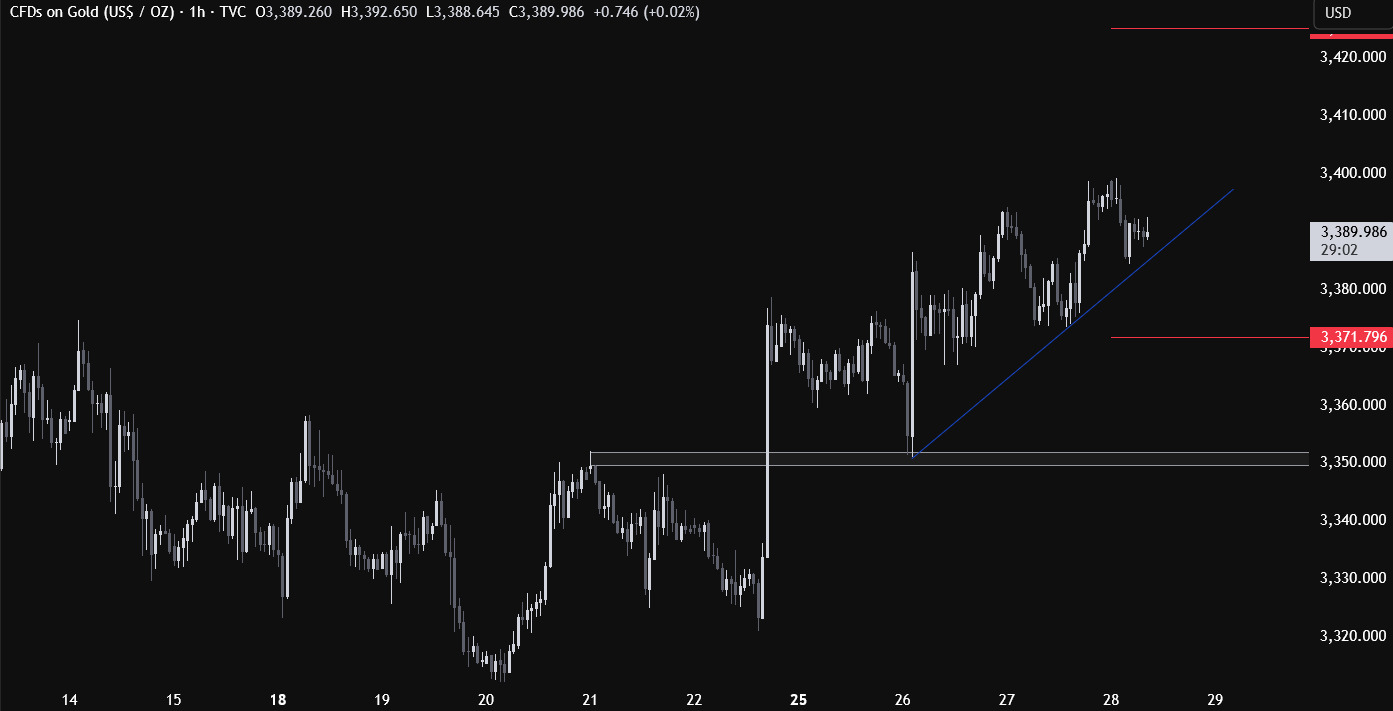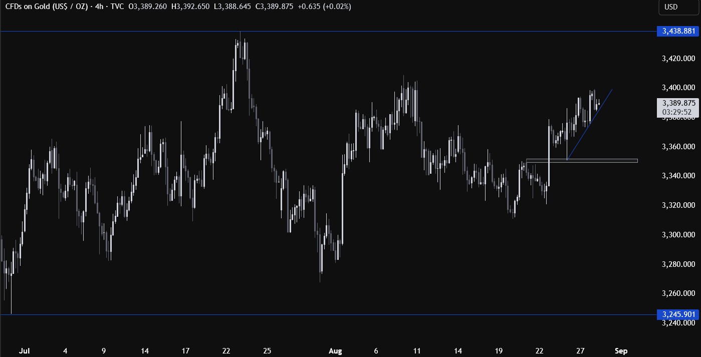 在4小时图上,可以看到一条短期上升趋势线支撑着当前的多头动能。买盘很可能会继续依托这条趋势线,在其下方设置风险控制,推动金价进一步走高。空头则会等待价格跌破趋势线,再押注回调至3350。