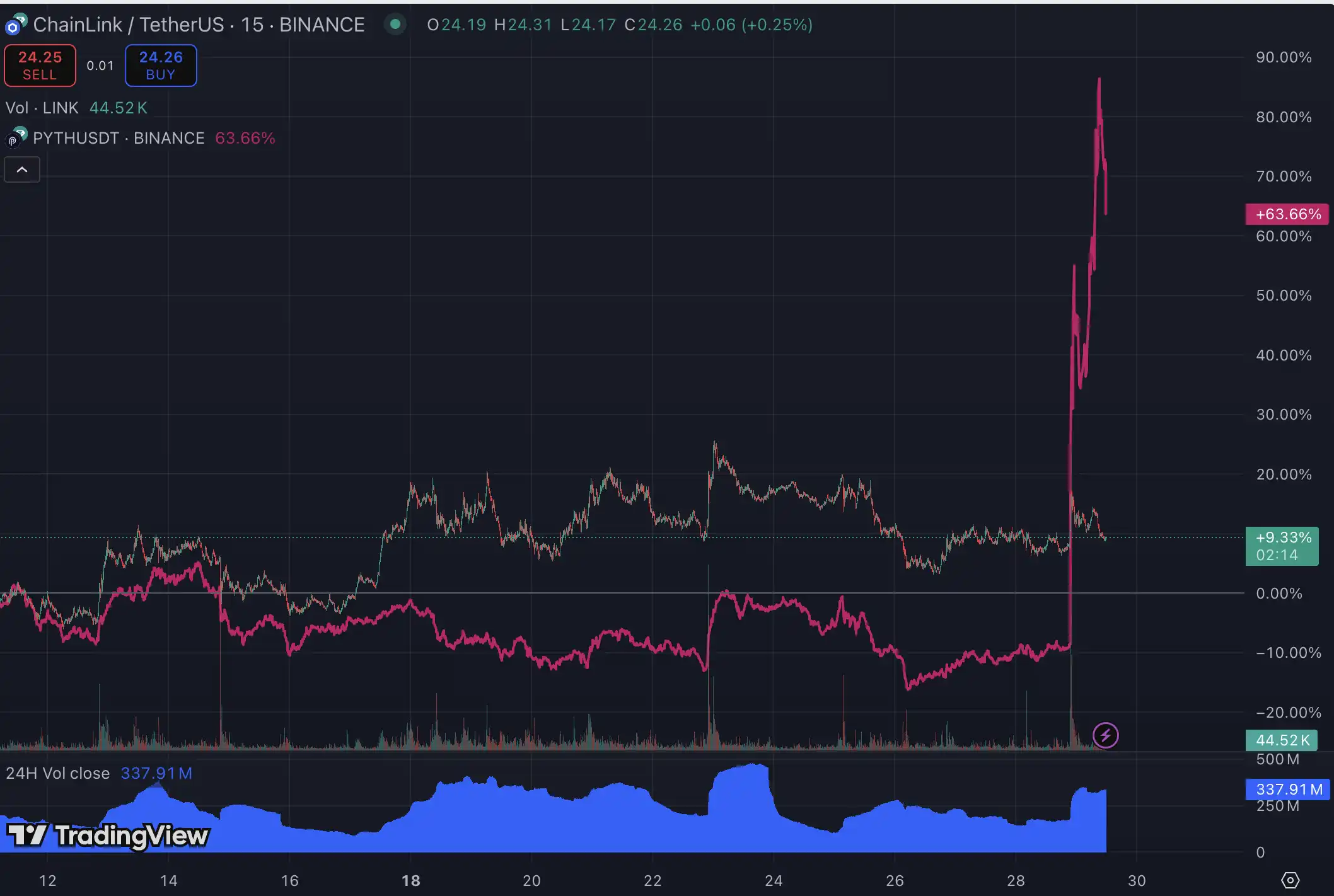 消息公布后,商务部合作的两个主要技术提供商,去中心化验证层 Pyth Network 的原生代币 PYTH 价格在 10 小时内一度飙升逾 108%,市值跃升至 10 亿美元上方,24 小时交易量激增近 27 倍。去中心化预言机服务提供商 Chainlink 的 LINK 代币也在 7 小时内上涨了 10%,而后价格回落至消息发布前的水平,现报价 24.28 美元。