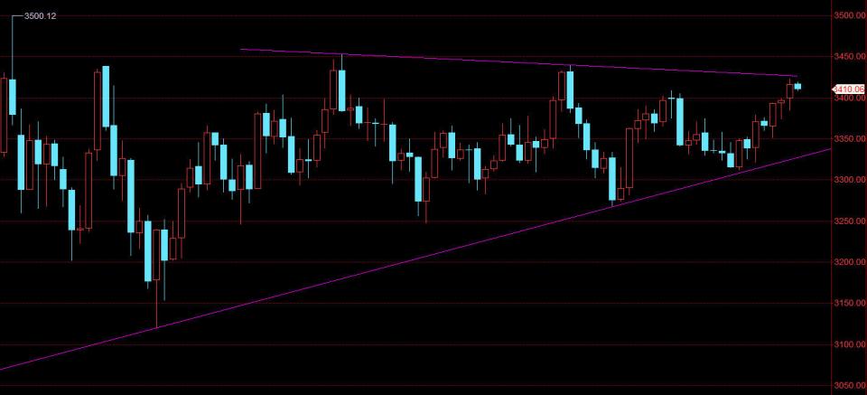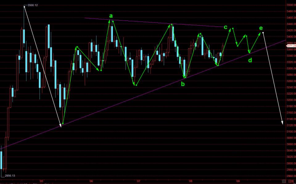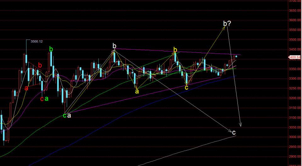 我们来看一下实际走势图,下图,基本轮廓还在框架之中,后面的关键就是3452和3268最后往哪边突破的问题。