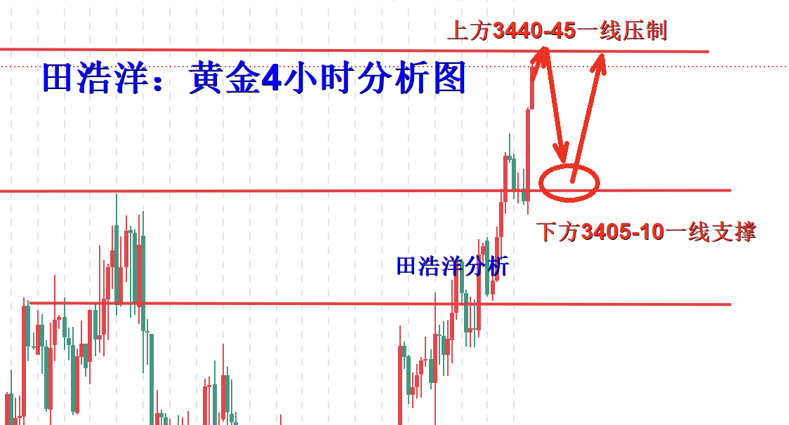 从4小时分析来看,下方支撑关注3398-3405附近,回踩依托此位置继续主多顺势看涨不变,短期多头强势分界线关注3380关口,日线级别企稳此位置上方继续保持回踩低多节奏不变,逆势空单一律不参与。具体操作策略我会在盘中提示,及时关注。