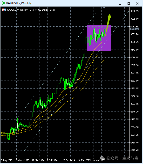 Inception: 2025-8-3周线图的次要节奏特征已经非常清晰:时间长,回调幅度小。表明多方人气始终整体占优,在对空方力量进行消耗后,就会再次向上拉升。在均线系统呈多头排列、上升通道完好的背景下,非常有利于次要节奏向上突破。短期走势的唯一变化是次要节奏范围内的反复性。Update: 2025-8-31