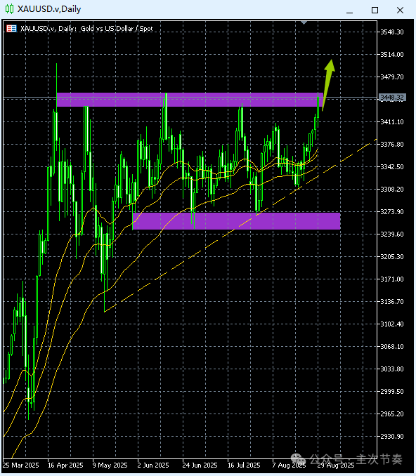 周线图上周收出的也几乎是光头阳线,并逼近了区间上沿。这是一个向上突破的契机,当前的高位横盘已经有19根k线,如果突破,至少也会有连续数周的拉升。客观涨势完美、高位次要节奏清晰,这是向上突破的有利信号。从不利的角度去思考,会发现近期比较缺乏大的风险信息来产生持续推力:美联储9月降息已经被市场逐渐认可,地缘局势似乎也没有太大恶化的空间。所以,如果这次不向上突破,或者只是一个假突破,那么会引发较深的回调。当然,这只是在做万一情况的防范思考,技术图形本身发出的依然是牛市状态。黄金日线图(中线)