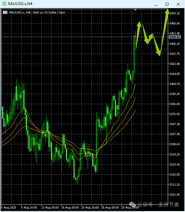 Inception: 2025-8-31毫无疑问,当前的黄金4小时图正处在一个上涨动能充盈的阶段,周初顺势冲高并不难,那么就将接近3500关口,去做大级别突破的尝试。如果在这个强阻力下方,黄金能有一个高位盘整蓄势的过程(而不是快速受阻转跌),将进一步确定向上突破的发生。从市场人气角度,在这种关键位置,如果是见顶,一定会是快速大幅度的崩盘。所以在周初的冲高后,只要能连续几天保持在高位盘整蓄势,就会为向上突破3500发放一枚定心丸。使用说明: