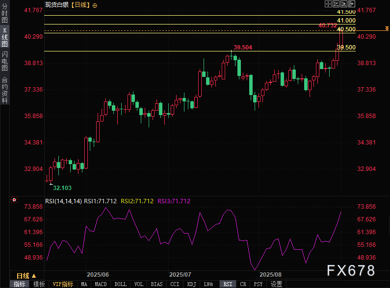 当前日线相对强弱指数(RSI)已逼近超买区间。在此情况下,谨慎的做法是等待银价出现一定整固或适度回调,再考虑建立新的多头头寸,并为后续升值行情布局。
