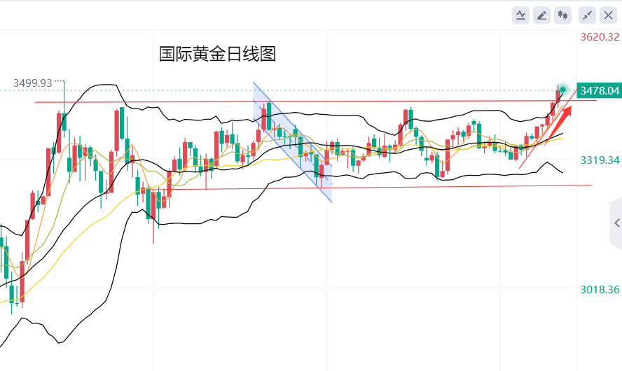 从之后的走势看,亚盘开盘后,黄金小幅回落,最低跌至3437美元,不过金价很快企稳反抽,不到2小时时间,连续突破3453和3470美元附近压力,快速上涨至3486美元,遇阻后金价回落3470美元企稳,欧盘开盘再次刷新日高至3489美元,逼近历史高点3499美元,此后金价小幅回落,欧美盘期间保持3466到3481美元区间震荡运行。总体来看,黄金最低回落3437美元企稳上涨,逼近3500美元整数位置,涨势基本符合我们的看涨预期。