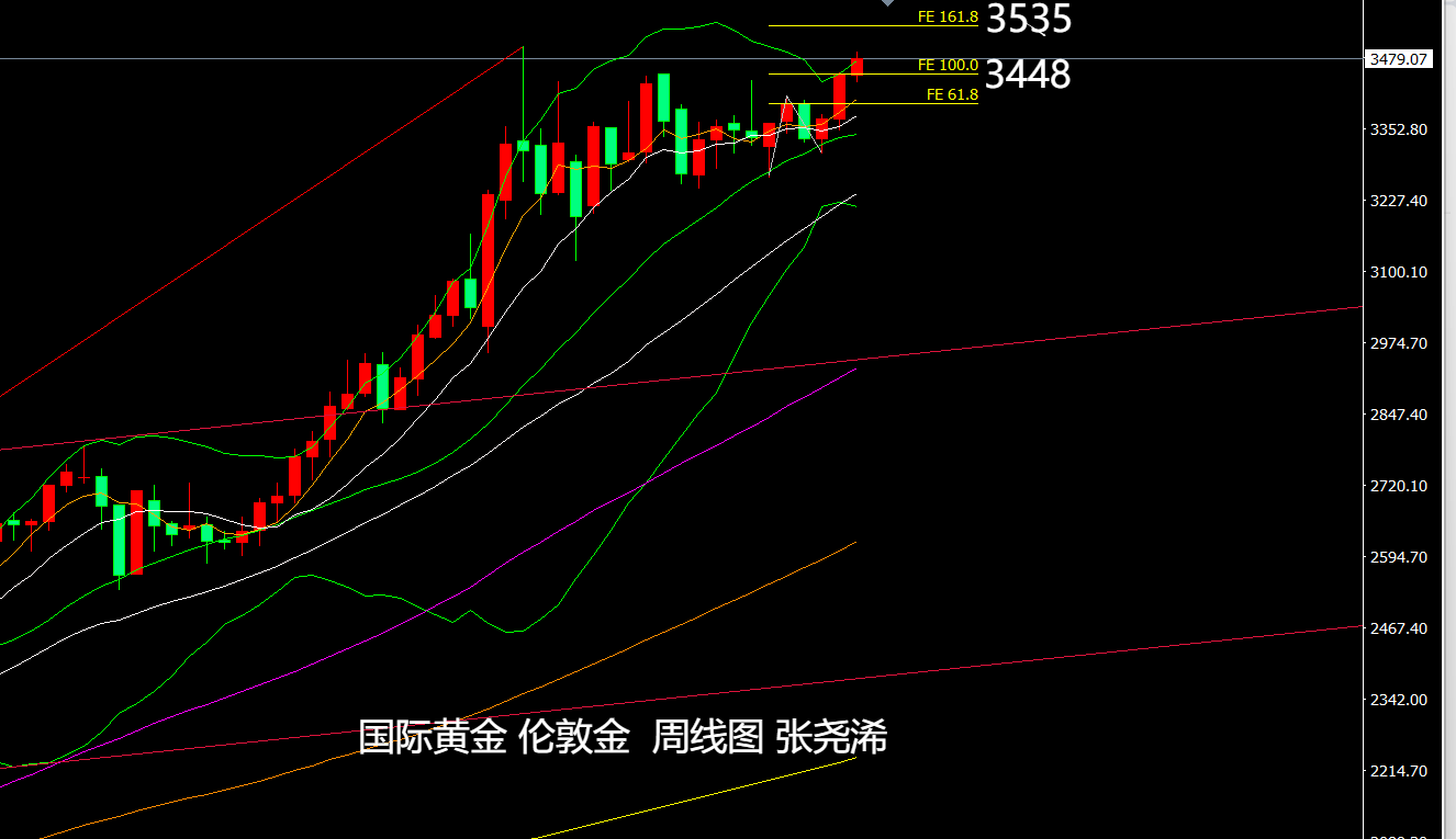 周图,金价自去年开涨攀升以来,如期第4次再度回踩中轨线支撑,并在震荡调整后,再度向上反弹走强,目前布林带向上开口延伸,看涨前景加强,附图指标空头信号持续减弱,本周或下周有望冲击3535美元附近目标。