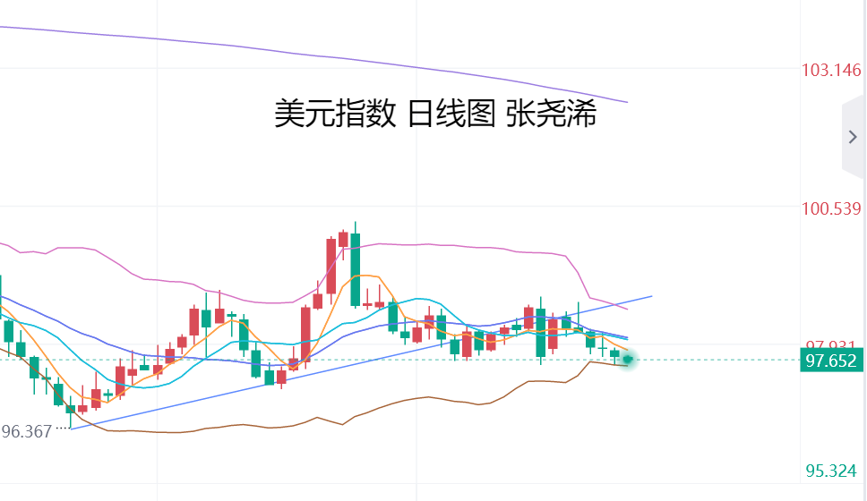 美元指数方面,日图近日持续运行在上升趋势线支撑下方,空头力量加强,走势偏弱,则会支持金价,周图也运行在中轨下方,前景偏弱,整体上,将会利好金价多头,故此,对于金价来说,短期仍将维持强势。