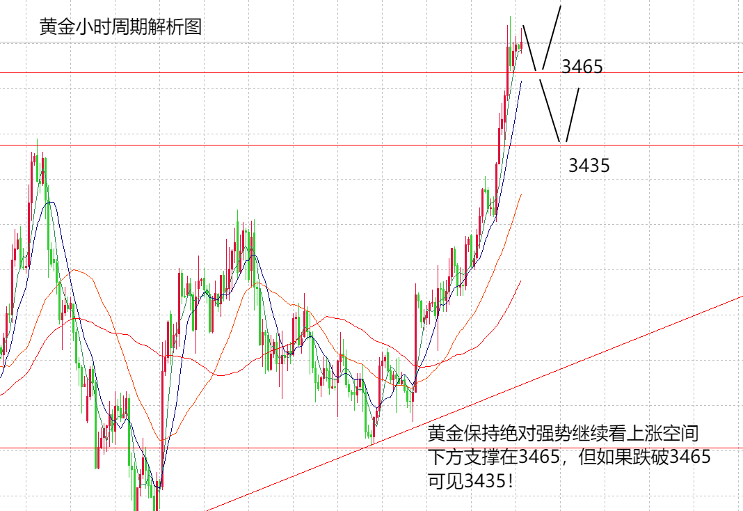 先下结论,周一黄金大涨,周二保持强势,继续看涨,但谨慎追高,需在关键点位交易。周一黄金在回落至3437后出现暴涨空间,走势过急,导致这波多头力度没有跟上,在上涨至3490后出现回落,美盘多次调整至3465后无力,形成高位震荡,所以,山海在美盘给出3472的多单,再看上涨空间。目前价位在3485附近,依旧处在绝对强势的高价位附近,那么,今天维持周一的看法,在多头趋势中继续看涨,但需要等待调整确定后做多。技术面内,在日线周期看涨中,上方只有一个相对高点3502可看,今天继续上涨就看个3505的高点即可,但如果出现调整回落,下方就关注3465支撑点得失,不破此点位,依旧保持绝对强势看上涨空间,但破位此点位,日线可能进入调整空间,下方还有空间可看,所以,在这种绝对强势行情中,即使要继续看涨,也要等待调整做多。H4周期还没有收口,在强势中,也处于单边均线之上,回落就看均线支撑点3465,上涨则无法猜顶。不过参考前期高点,如果亚欧盘直接上涨至3510后,首次不破,这里的压制点有一定的回落空间。