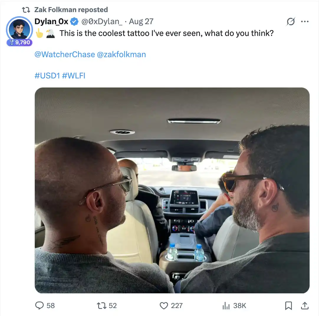 据其本人发言,当时他带着一身纹身站在草坪上,Zach 恰好开车经过——「他能看出我有点格格不入,然后他说『来,跟我坐一辆车』,就在高尔夫球车上,我们瞎聊了起来。」就这样,Witkoff 家族将 Chase Hero 及后者的长期商业伙伴 Zak Folkman(WLFI 另一联创,曾经营一家名为「Date Hotter Girls」的公司)介绍给了特朗普家族。随后两个家族一拍即合,与二人联手打造了如今的 WLFI 项目。