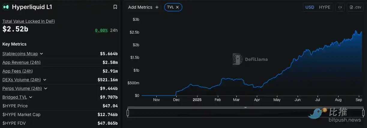 其资金沉淀同样令人瞩目:今年初,Hyperliquid 的总锁仓量(TVL)仅为 3.17 亿美元,而到 9 月,已飙升至 25 亿美元,实现了近八倍的增长。这一切都说明,Hyperliquid 正在迅速获得用户的青睐,成为资本和交易流动性的重要聚集地。