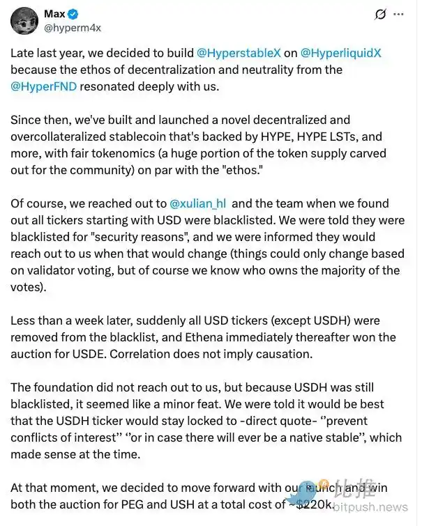 该生态的老牌稳定币协议 Hyperstable 的开发者 Max 率先发声。他指出,过去 USDH 代号曾被黑名单化,迫使他们只能启用「USH」作为稳定币符号。如今,基金会突然解封 USDH,让 Hyperstable 感到规则被临时修改,「对已经投入大量资源的团队极不公平」。