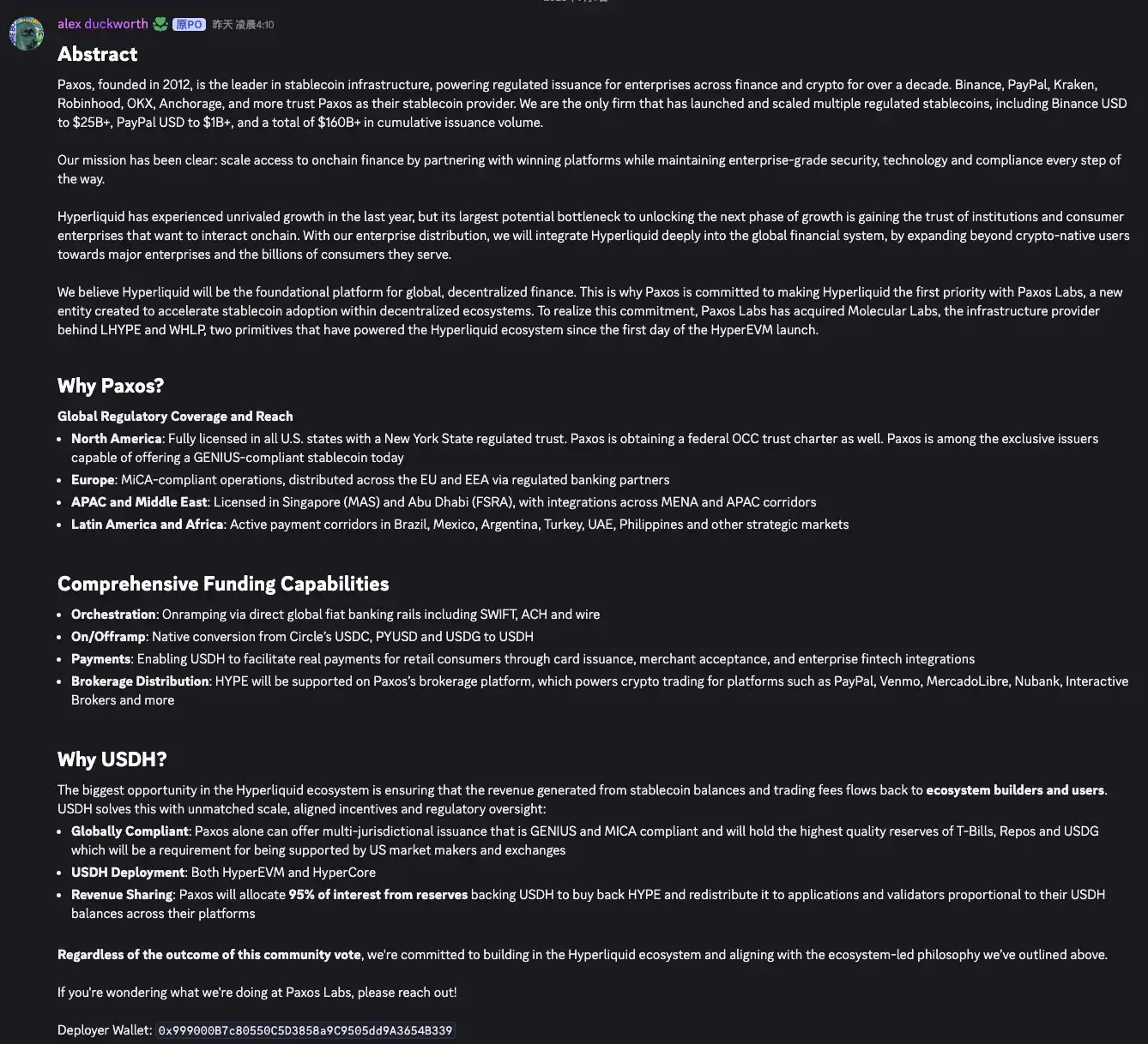 老牌合规稳定币机构 Paxos(曾发行 USDP 和 PayPal USD)率先提交提案。Paxos 承诺将 USDH 打造为「Hyperliquid 首发」的合规美元稳定币,完全符合美国《稳定币创新法案(GENIUS)》和欧盟 MiCA 法规标准。技术上,USDH 将由 Paxos Labs 部门运营,在 Hyperliquid 的两条链(HyperEVM 和 HyperCore)上原生发行。