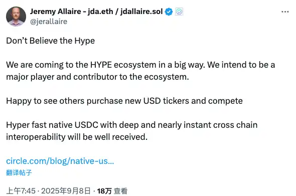 此次竞标大战也让更广泛的行业参与者纷纷表态。而 USDC 的发行商 Circle 的 CEO Jeremy Allaire 则首当其冲的,他在 X 平台发声,欢迎竞争并表示「不要轻信炒作,Circle 也将大举进入 HYPE 生态」。