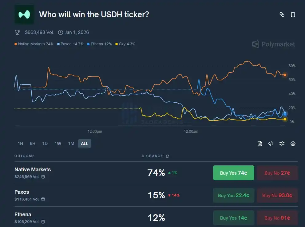 9 月 10 日,据 Polymarket 页面,Hyperliquid 稳定币 USDH 竞拍战中,Native Markets 获胜概率现报 74%,领先一众第三方参与竞拍者,Paxos 以 15% 的获胜概率排名第二,Ethena 排名第三,获胜概率为 12%。