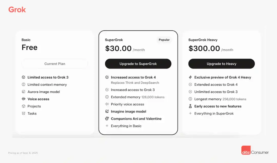 Grok 的定价更是把这种策略推到了极致:SuperGrok 计划每月 30 美元,SuperGrok Heavy 计划每月 300 美元,后者解锁新模型(Grok 4 Heavy)、模型的扩展访问、更长的记忆和新功能测试。这种 10 倍的价格差异在传统消费级软件中几乎是不可想象的,但在 AI 时代却变得合理,因为不同用户的需求和价值感知差异巨大。