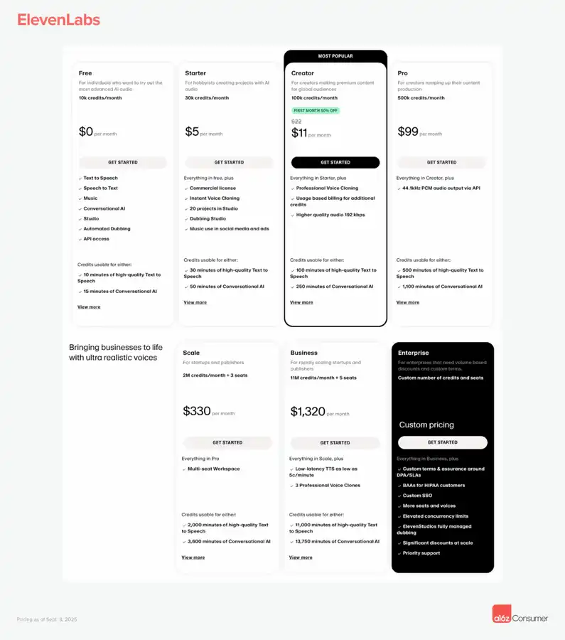 ElevenLabs 是一个很好的例子:该公司开始时大量使用消费者,但迅速构建企业级能力,为其语音和对话代理添加 HIPAA 合规性,并定位自己为医疗保健和其他受监管市场提供服务。这种快速的企业化转型让他们能够抓住高价值的企业客户,而不仅仅依赖消费级收入。