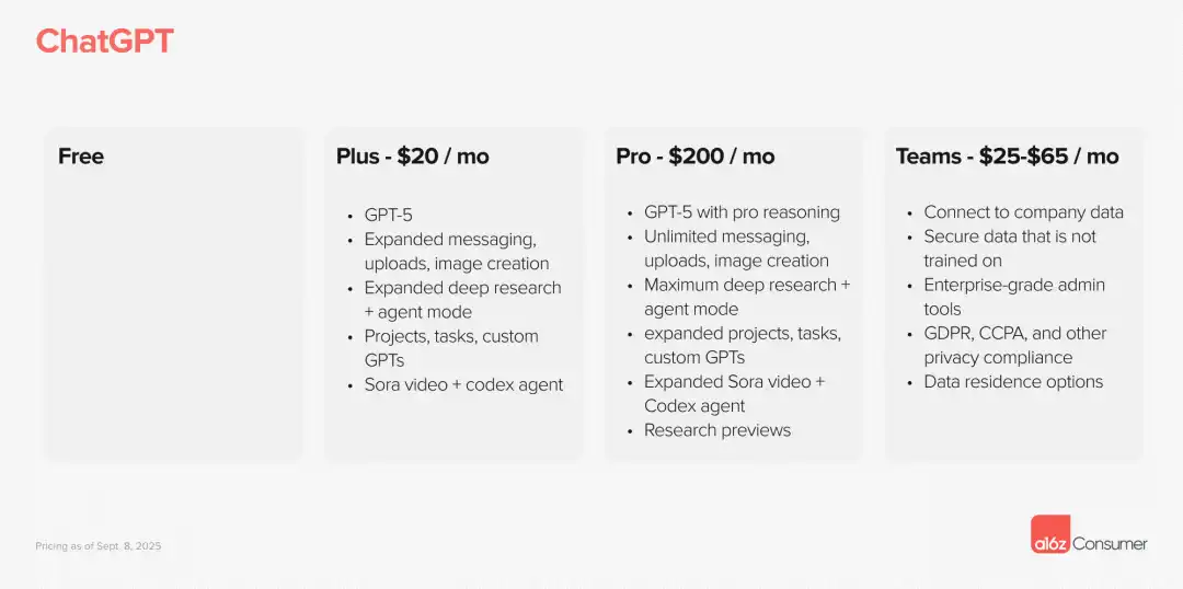 配备了这些功能,定价差异可以是巨大的。ChatGPT 就是一个很好的例子,虽然它不被广泛认为是团队产品,但其定价突出了差异:个人订阅每月 20 美元,而企业计划范围从每用户 25 美元到 60 美元。这种 2-3 倍的价格差异在传统消费级软件中很少见,但在 AI 时代却变得常见。