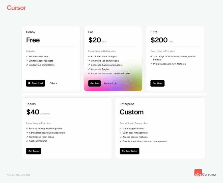 Replit 为 Core 用户提供每月 20 美元的计划。团队计划从每月 35 美元开始,包括额外积分、查看器席位、集中计费、基于角色的访问控制、私有部署等。Cursor 提供每月 20 美元的 Pro 计划和每月 200 美元的 Ultra 计划(使用量增加 20 倍)。团队用户为 Pro 产品支付每月 40 美元,配有组织范围的隐私模式、使用和管理仪表板、集中计费和 SAML/SSO。