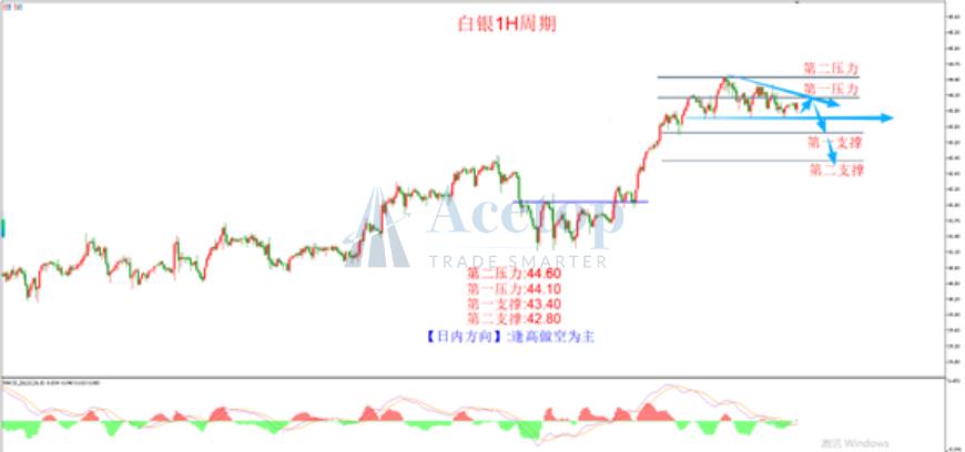上图为白银1小时图,白银创出历史高点44.50后,多头开始动能减弱,呈现高位震荡节奏,目前看高点降低有望下行倾向,短线关注43.60支撑位能否跌穿,一旦强势破位会形成高位头肩顶顶部形态,行情将要展开一波下行浪趋势。从下方MACD指标来看,快慢线高位死叉信号出现且不断震荡走低,表明多头无力行情进入调整浪下行节奏。策略上建议顺着调整浪节奏找压力位埋伏空单思路为主。