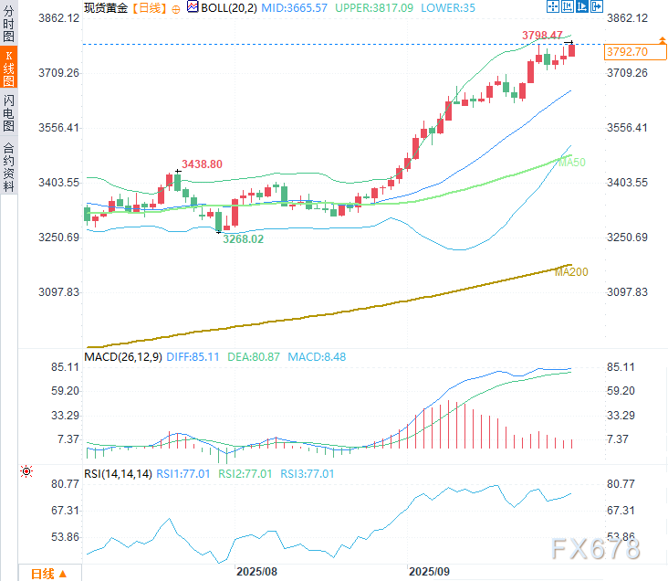 上行方面,关键阻力见于3800-3810美元区间,该区域汇聚了整数心理关口及布林带上轨。若能有效突破该阻力带,金价有望上探3850美元目标位。