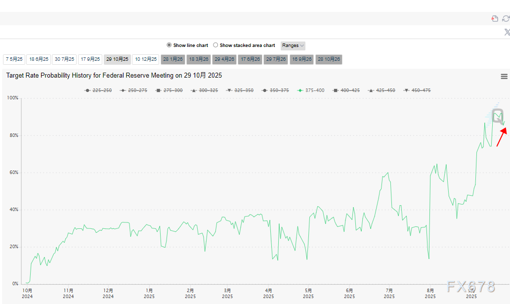 环比维度,整体PCE与核心PCE分别上涨0.3%和0.2%,数据整体呈现“温和通胀”特征。独立金属交易员泰·王分析指出:“月度PCE数据符合预期,仅个人收入与支出数据略高于预期0.1个百分点,这一数据不会阻碍美联储在10月会议上继续实施谨慎降息。”根据芝商所(CME)美联储观察工具,当前市场对10月降息的定价概率已回升至88%,12月再次降息的概率亦达65%,政策宽松预期持续为金价提供支撑。