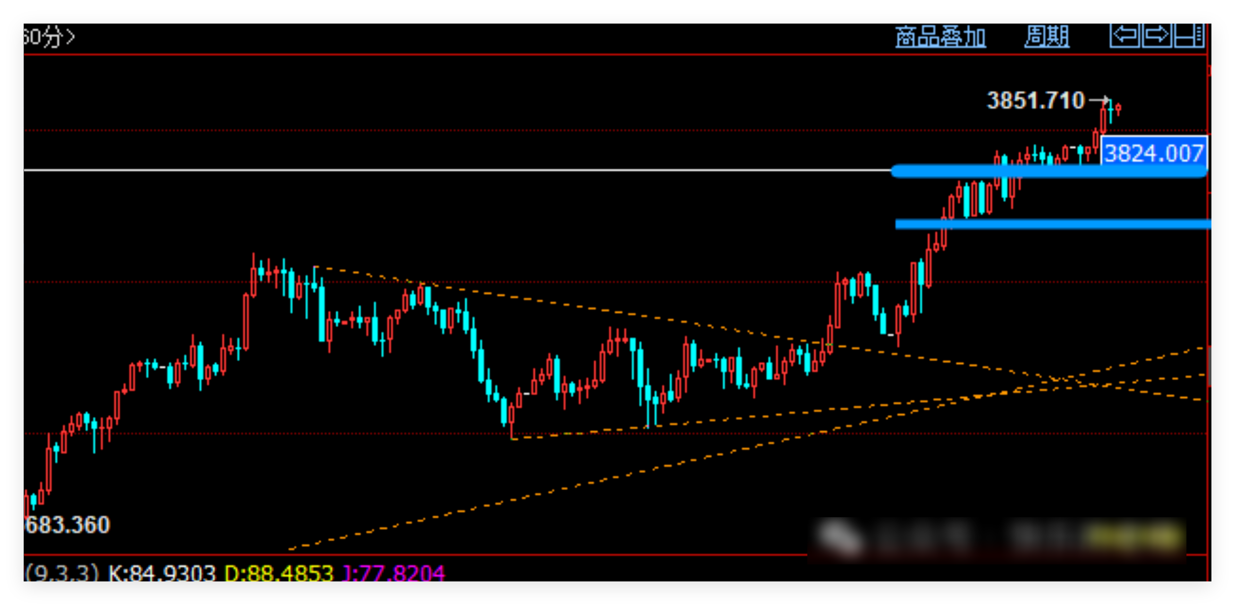 当前影响黄金的主线,美联储降息大门的开启,10月份降息预期的推动;美国政府面临停摆的风险,全球地缘局势,尤其是俄罗斯和乌克兰之间的争端;特朗普即将实施的行业税收。一系列的风险事件,推动大量资金进入黄金市场,昨日黄金早盘3760区域企稳后快速大涨,刷新历史新高3791美元站稳3800美元后迎来加速上涨,截止目前为止,黄金最高3851.9美元附近;已经完全抵达我们预期的第一目标3850美元,接下来关注冲击第二目标3880美元区域,甚至顺带挑战3900美元大关。