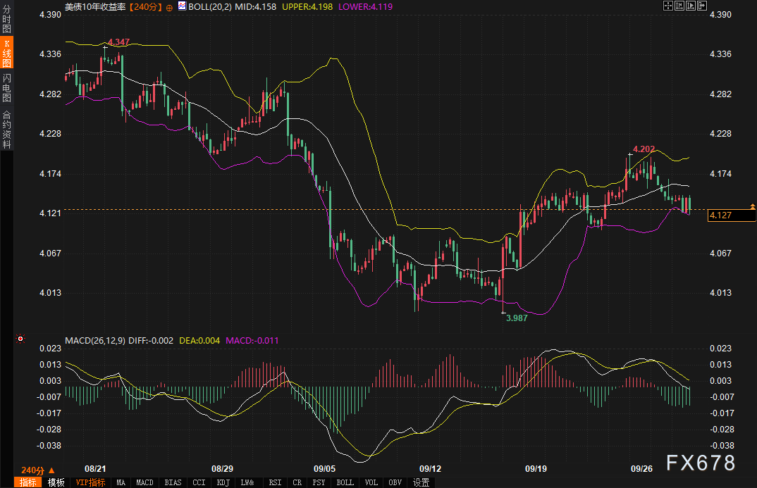 转向10年期美债收益率的240分钟图,当前报价4.127%正经历小幅回落整理,触及4.202%前高后,价格已跌破布林带中轨4.158%,逼近下轨4.119%的支撑强度。这反映了短期动能从强劲上行转为偏弱整理,市场在前期快速拉升后的技术修正中,寻求新平衡。