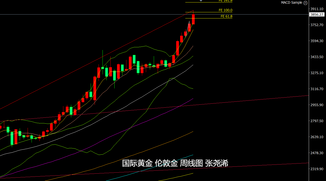 周图,金价自去年开涨攀升以来,如期第4次回踩中轨线支撑,并再度展开持续向上攀升的多头行情,不断触及给出的看涨目标位,依托布林带上轨支撑连续走强,当下虽冲出布林带之外,有阻力回撤风险,但根据前几周表现和指标信号来看,回撤力度也有限,整体走强趋势未有减弱迹象,留意本周收线情况,如收线在3815美元一线或下方,则后市可能面临回调走低到3700美元下方的行情预期,如收线在3875美元上方,则后市有望进一步冲击3970美元,反之维持在此区间之内,将进行震荡调整波动。