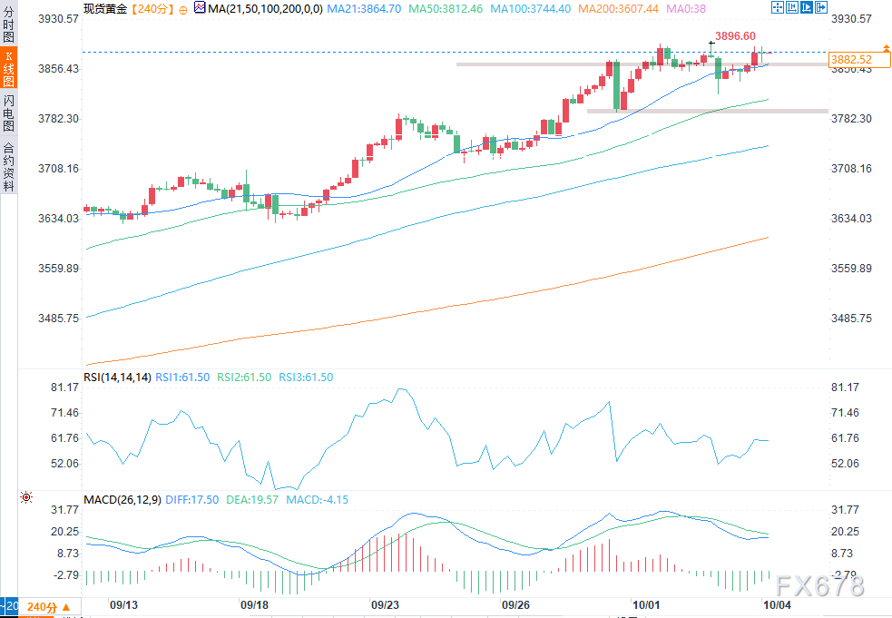 黄金在经历周四的剧烈波动后企稳,回调过程中涌现出逢低买盘。3860-3865美元区间构成了前期的阻力位,现已转为支撑位,目前价格高于4小时图上21期简单移动平均线(SMA),该均线位于3864美元附近。